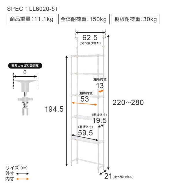シェルフ×5、PPシート×5、コの字バー×1、スリーブ×24(+予備2)、テンションポール(テンション+中間+下部)×2、ポール(上部+中間+下部)×2、ねじ×6、ワッシャー×6 ※キャップ×2、ジョイント×8、アジャスタ―×4は予めポールにセットされています。 |