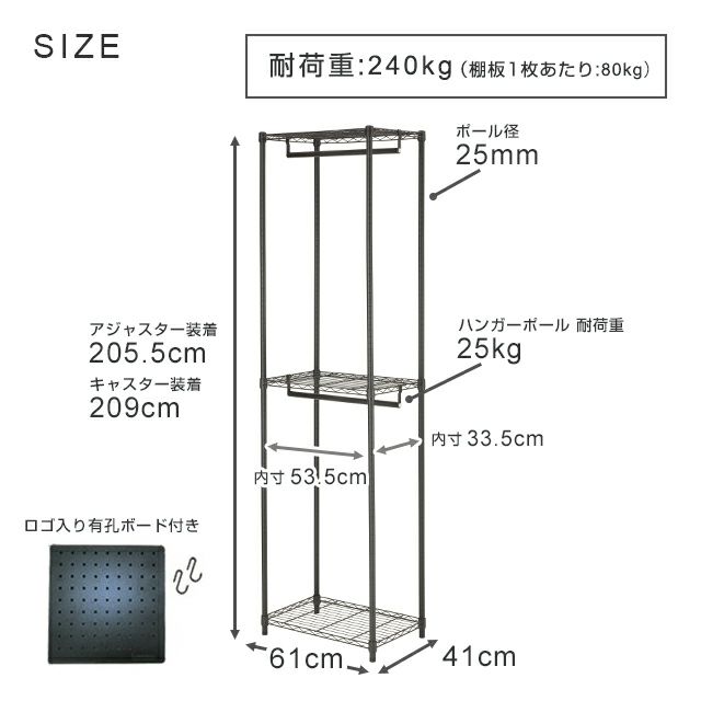 幅61×奥行41×高さ209.5cm(キャスター装着時)、高さ205cm(アジャスター装着時)