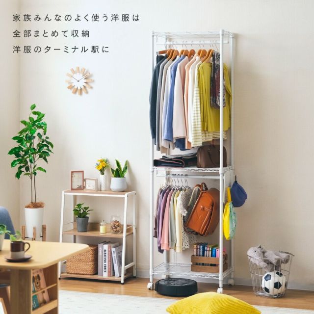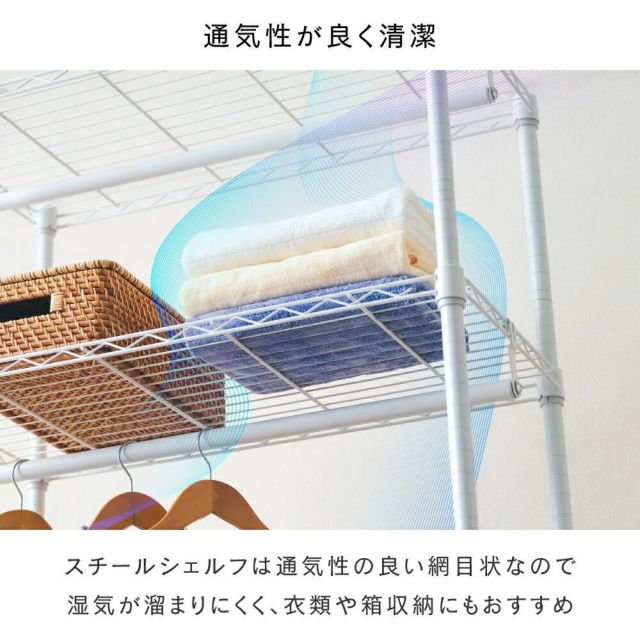 シェルフ×3枚、スリーブ×12組(+予備1組)、ポール(分割式)×各4本、アジャスター×4個、キャスター(ストッパー付)×2個、キャスター(ストッパー無し)×2個、スパナ×1個、ハンガーポールセット×2セット、S字フック×2個、有孔ボード×1枚