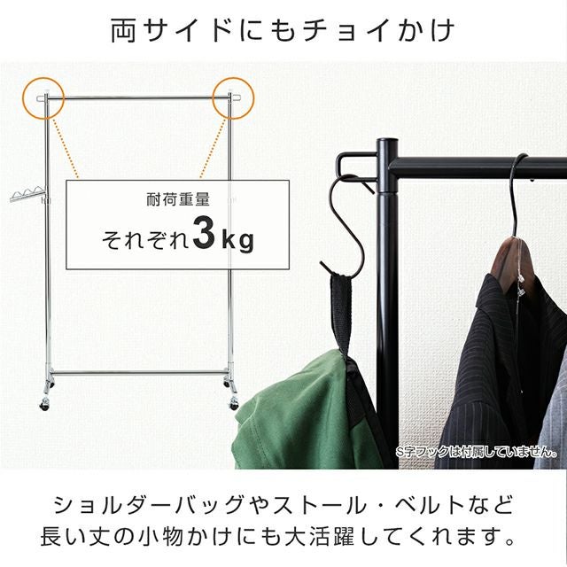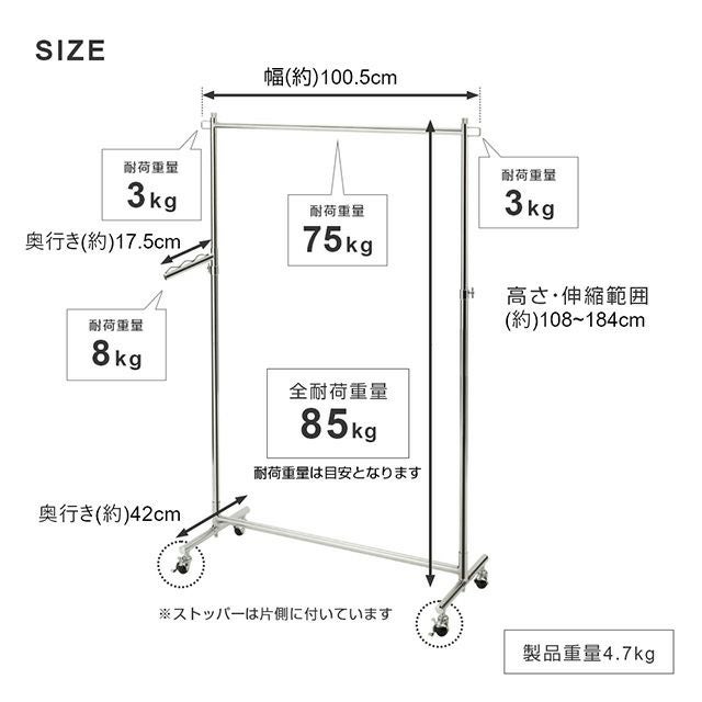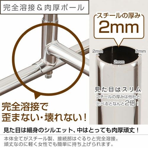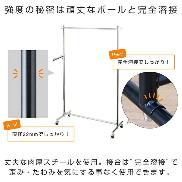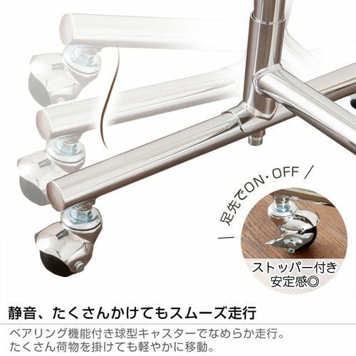 量だけでなく、重たい衣類などもしっかり掛けられるハンガーラックです。キャスター性能も高く、移動もスムースなのでアパレルショップや倉庫など、法人用のプロユースとしても人気の商品です。