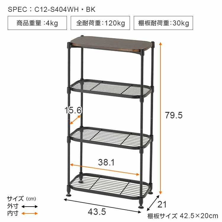 スチールラック 幅40cm 4段 ルミナススマート 玄関収納 キッチン収納 幅43.5×奥行21×高さ79.5cm C12-S404