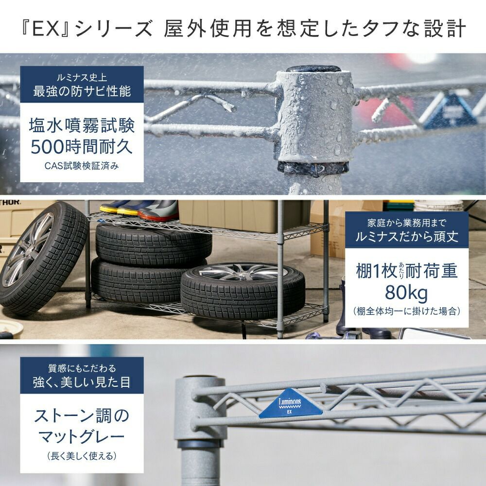 ルミナスでは防錆性の高い屋外に適したラックを用意し、収納だけでなく植物なども飾れるような便利な収納棚を揃えています。