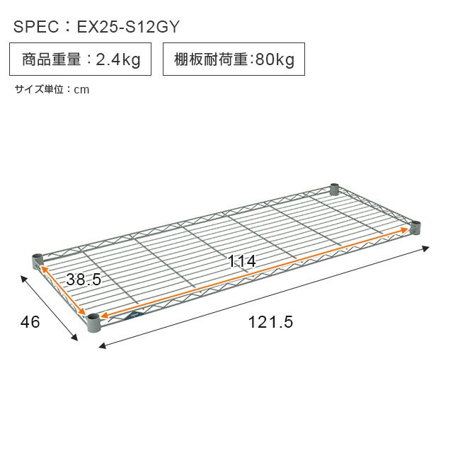 スチールシェルフ 幅121.5×奥行46cm グレー ルミナスEX スチールラック パーツ 棚 ポール径25mm用 幅120cm EX25-S12GY