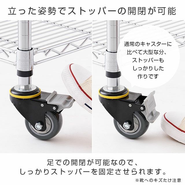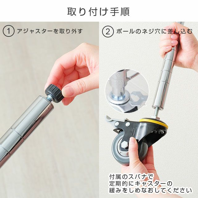 ・組み立てのシェルフ最下段は、ポールから3ピッチ目よりも下の位置に取り付けてください。 ・キャスターご使用時は定期的に緩みがないか点検をお願いいたします。