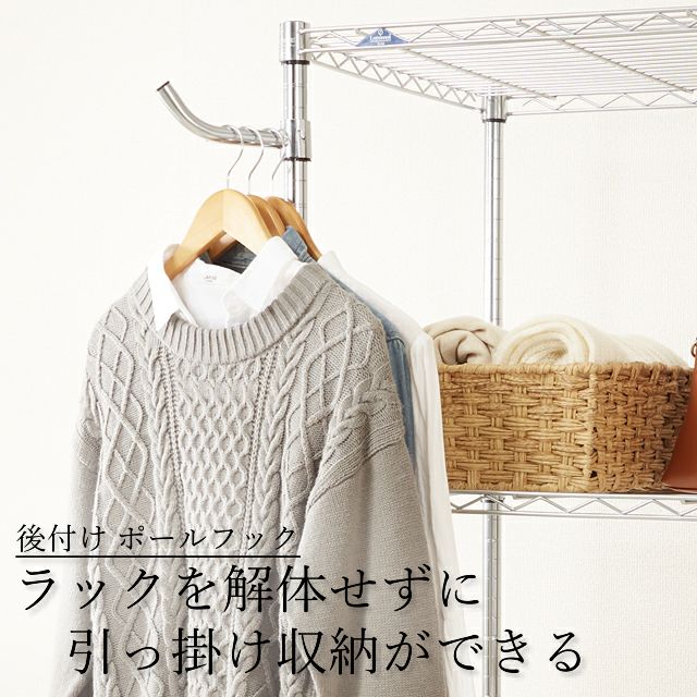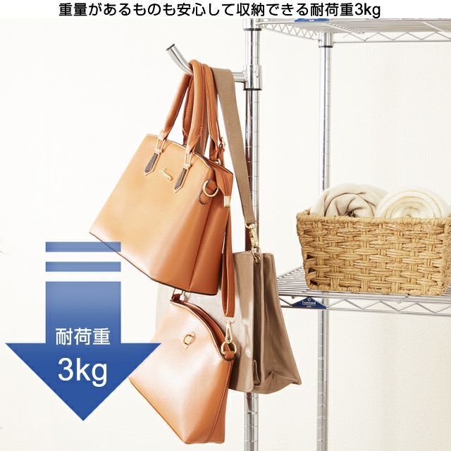 ハンガーを掛けるだけでなく、バッグや帽子などファッション小物の収納にも最適です。ポール径25mm/19mmどちらにも対応します。