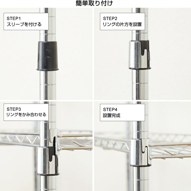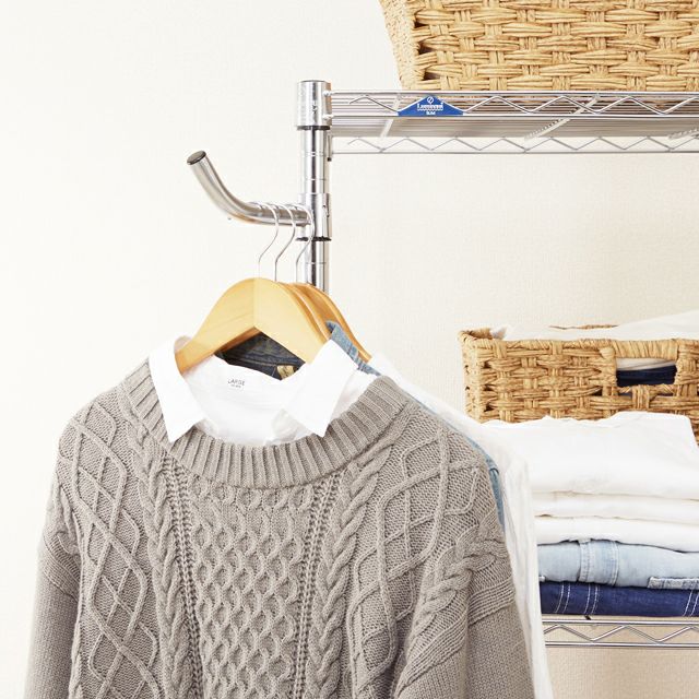 スチールシェルフに掛けるだけでハンガーラックが完成するなど、簡単にスチールラックを簡単に衣類収納にカスタムできるのが『衣類収納パーツ』です。取り付け・取り外しも簡単なので用途に応じてアレンジが可能です。