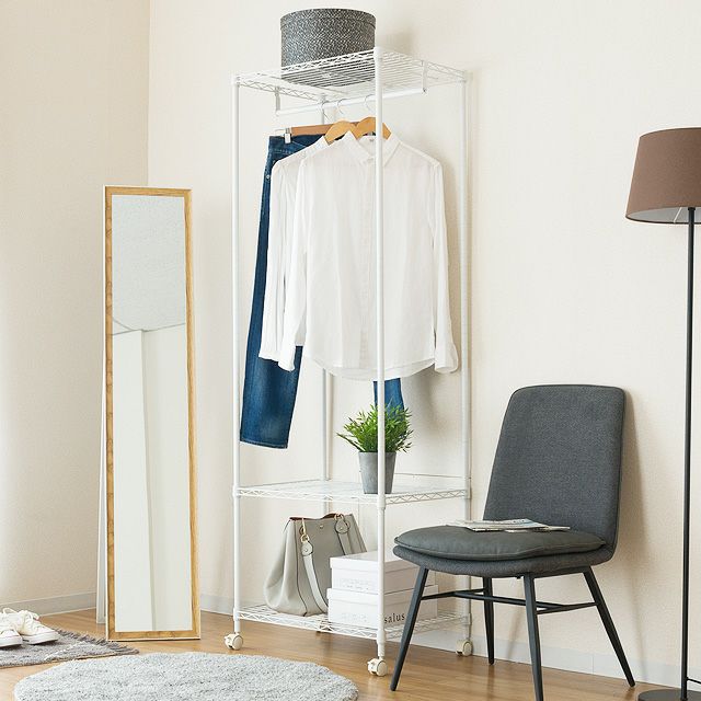 スチールシェルフ(棚板)×3枚 スリーブ(棚取付用部品)×12組(+予備1組) ポール×各4本 ストッパー付きキャスター×2、ストッパー無しキャスター×2 ハンガーポールセット×1セット(ネジ・ワッシャー×各2個、ハンガーポール×1、ハンガーポール用フック×2個で1セットになります) スパナ×1個 |