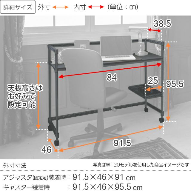 | アジャスタ時:幅91.5×奥行46×高さ91cm キャスター時:幅91.5×奥行46×高さ95.5cm |