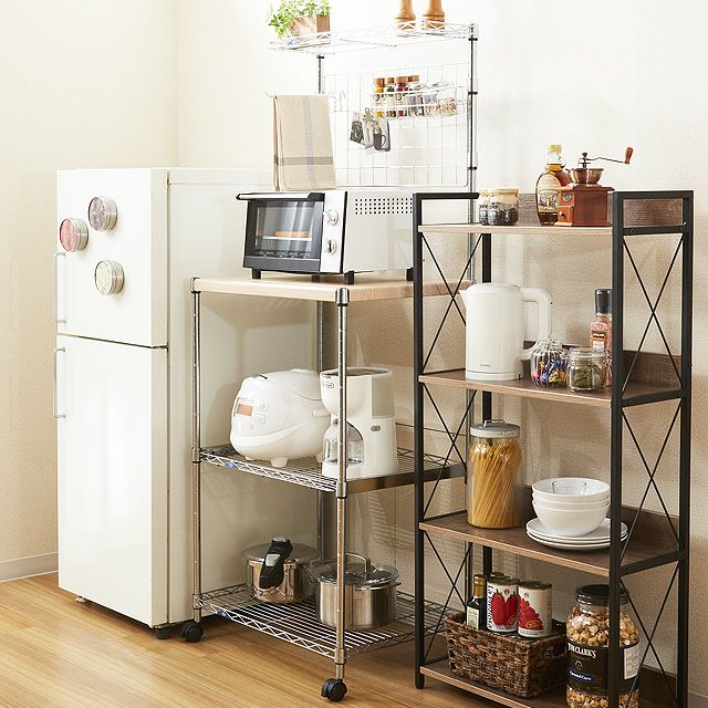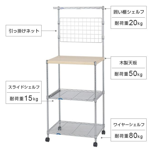 シェルフ、ハーフシェルフ、スライドシェルフ、背面ネット、ポール:スチール(クロームメッキ) 木製シェルフ:(天板)MDF、フレーム:スチール(クロームメッキ)スリーブ:ABS樹脂 キャスター:ナイロン樹脂 |