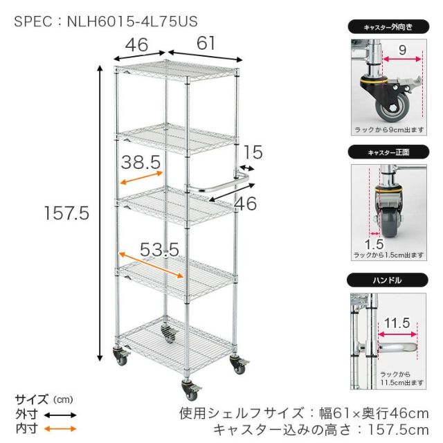 (棚板のみ)幅61×奥行46×高157.5cm (ハンドル含む)幅72.5×奥行46×高157.5cm |