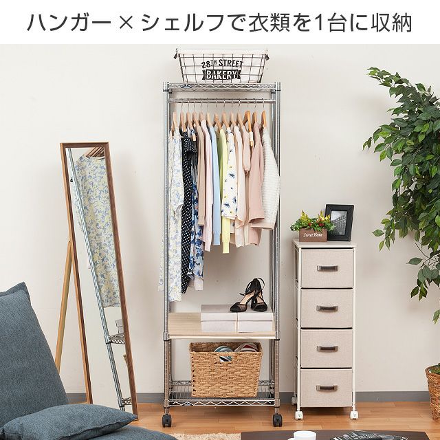 セット内容 | スチールシェルフ(棚板)×3枚 スリーブ(棚板取付用部品)×12組 ハンガーポール×1本 ポール×4本 ナイロンキャスター(ストッパー付)×2個 ナイロンキャスター(ストッパーなし)×2個 標準アジャスター×4個 スパナ×1個(キャスター取付用) |