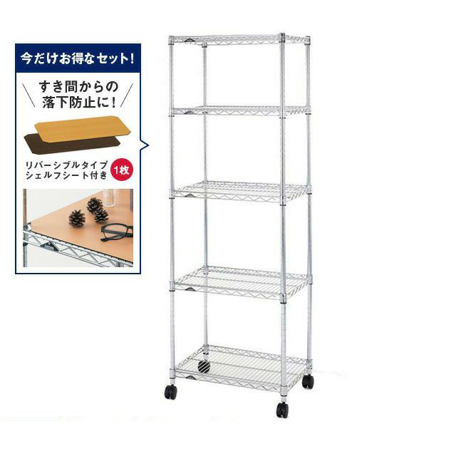 | セット内容 | スチールシェルフ(棚板)×5枚 スリーブ(棚板取付用部品)×22組 ポール×4本 ナイロンキャスター(ストッパー付)×2個 ナイロンキャスター(ストッパーなし)×2個 標準アジャスター×4個 スパナ×1個(キャスター取付用) リバーシブル ウッドシート[ナチュラル&ダークブラウン]×1 |