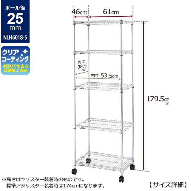 | 外形寸法 | アジャスタ装着時:幅61×奥行46×高さ174cm キャスター装着時:幅61×奥行46×高さ179.5cm |
