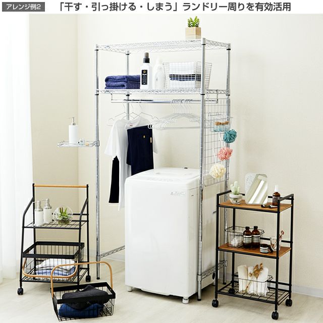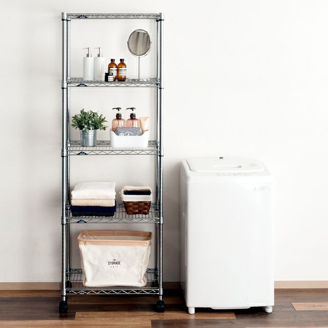 | 材質 | スチールシェルフ(棚板)・ポール:スチール(クロームメッキ) ナイロンキャスター:ナイロン樹脂 スリーブ:ABS樹脂 |