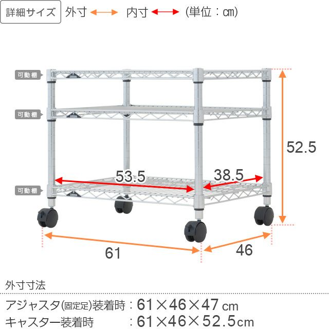セット内容 | スチールシェルフ(棚板)×3 スリーブ(棚板取付用部品)×12組 ポール×4 ナイロンキャスター(ストッパー付)×2 ナイロンキャスター(ストッパーなし)×2 標準アジャスター×4 スパナ×1(キャスター取付用) |