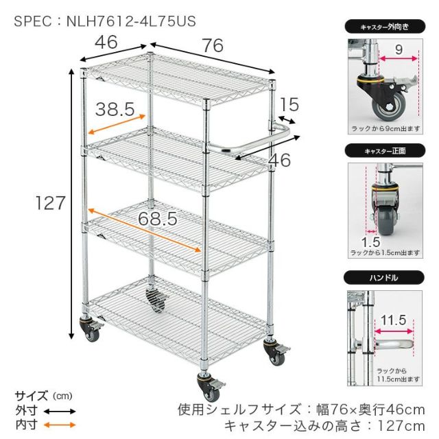 (棚板のみ)幅76×奥行46×高127cm (ハンドル含む)幅87.5×奥行46×高127cm |