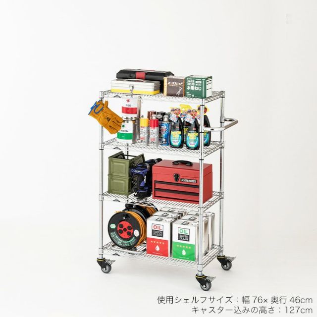 スチールシェルフ SHL7645SL(JAN:4550454517341)×4枚 打込式ポール ADD-UL090(JAN:4550454367816)×4本 延長ポール30cm2P ADD-P2530(JAN:4524871535196)×2セット ハンドル LHD-46SL(JAN:4550557075335)×1セット 高耐荷重キャスター L75US-GYU(JAN:4550454360534)×4個 |