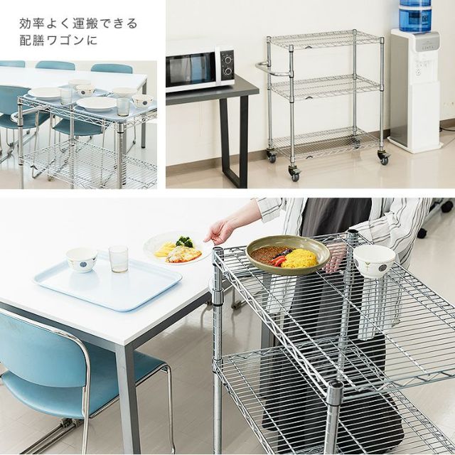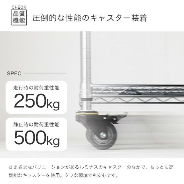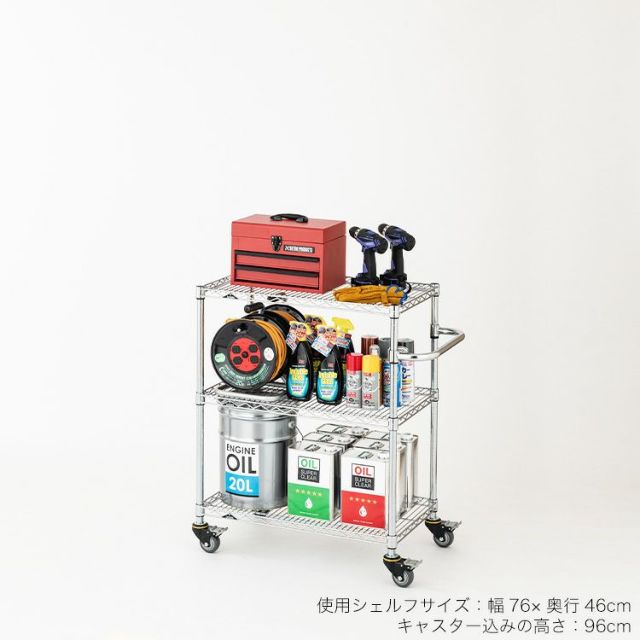 スチールシェルフ SHL7645SL(JAN:4550454517341)×3枚 打込式ポール ADD-UL090(JAN:4550454367816)×4本 ハンドル LHD-46SL(JAN:4550557075335)×1セット 高耐荷重キャスター L75US-GYU(JAN:4550454360534)×4個 |