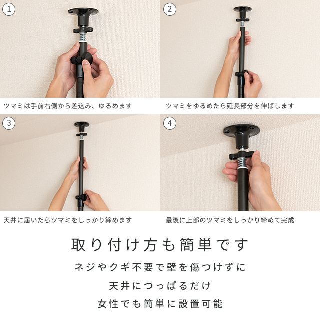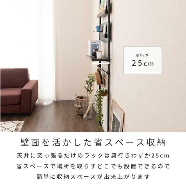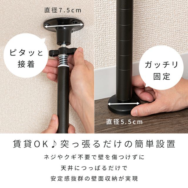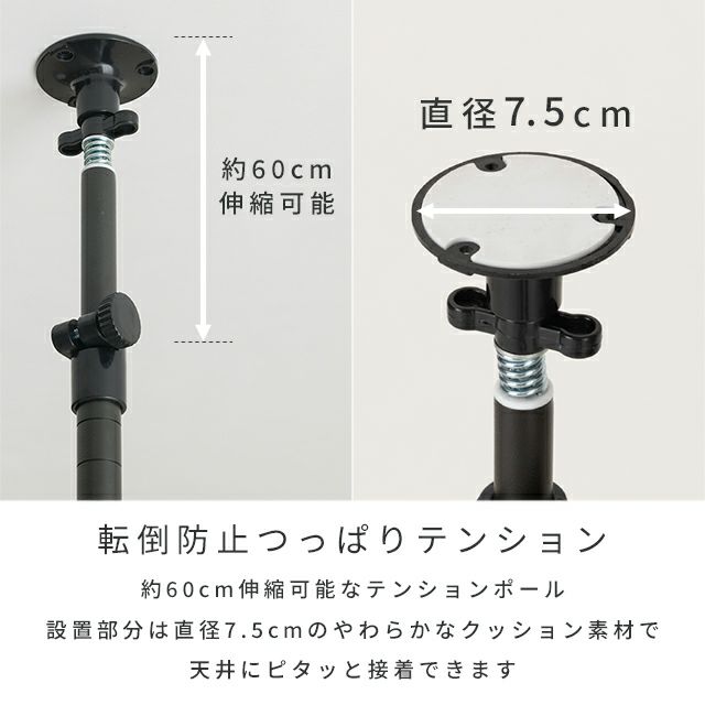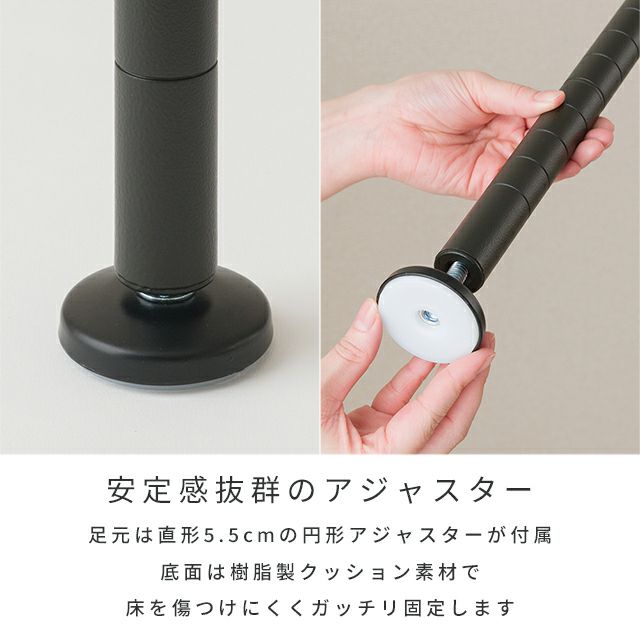 幅65×奥行25×高220~280cm(アジャスター装着時) ※中間ポールが約35cmですので、そちらを使用せずに上部+下部ポールのみで組み立てていただくことが可能です。 その場合、約185cm~ご使用いただけます。(最大高約245cm) |