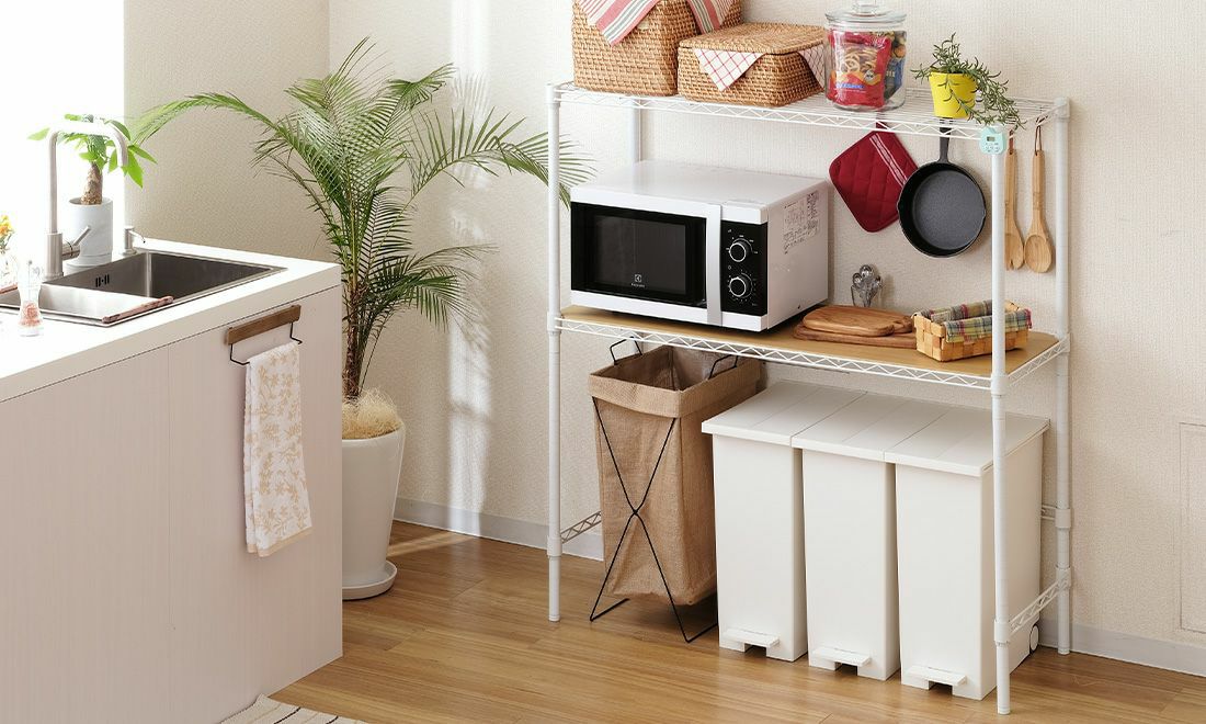 ゴミ箱上のデッドスペースを有効活用するラック。天板や棚にレンジ・トースター・コーヒーメーカーをまとめて置け、動線がスッキリ。豊富なサイズ展開から家電の大きさやキッチン幅に合わせて選べるので、限られた空間でも“置きたいものが収まる”収納を実現します。