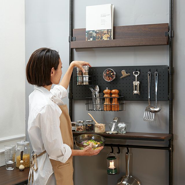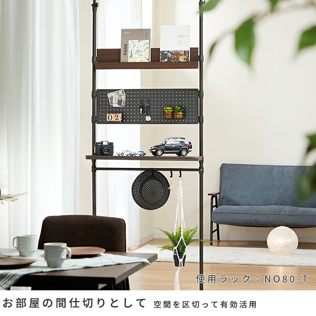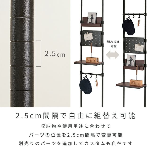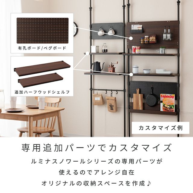 L字型木製棚×1 パンチングボード×1 ハーフウッドシェルフ×1 ハンガーポールセット×1(ネジ、ワッシャー、リング付属) ポール(3分割:テンションポール、中部ポール、下部ポール)×各2 テンションポール用ネジとワッシャー×6 S字フック×3 スリーブ×10(予備1組) 円形アジャスター×2 |