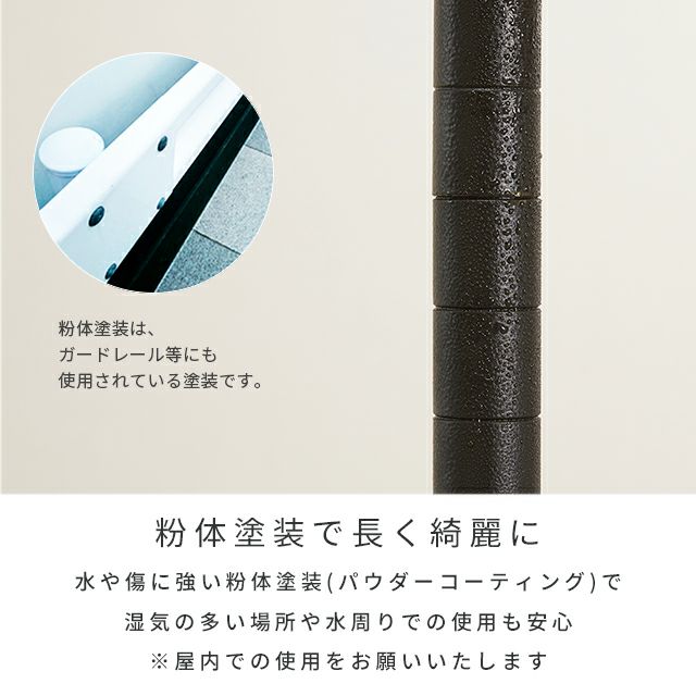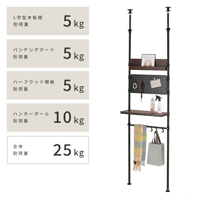 全体:25kg、ハーフウッドシェルフ:5kg、L字型木製棚:5kg、パンチングボード:5kg、ハンガーポール:10kg ※値はシェルフ全面に均等に荷重をかけた場合の値になります。 |