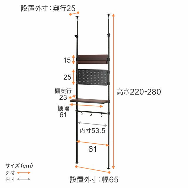 幅65×奥行25×高220~280cm(アジャスター装着時) ※中間ポールが約35cmですので、そちらを使用せずに上部+下部ポールのみで組み立てていただくことが可能です。 その場合、約185cm~ご使用いただけます。(最大高約245cm) |