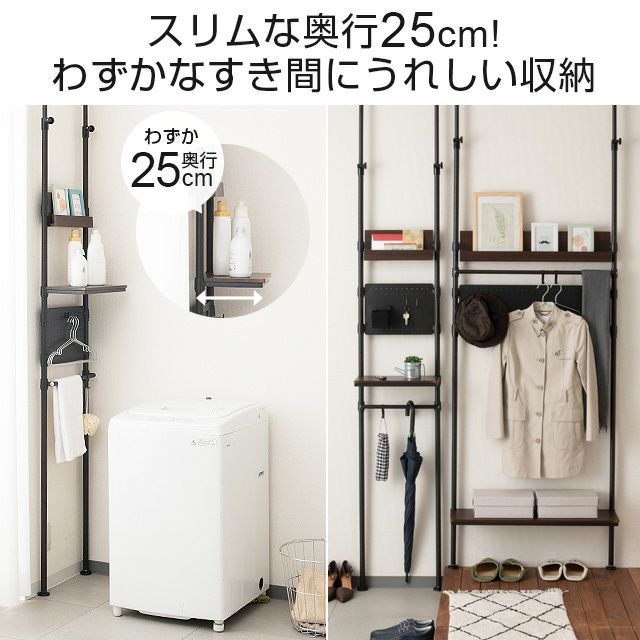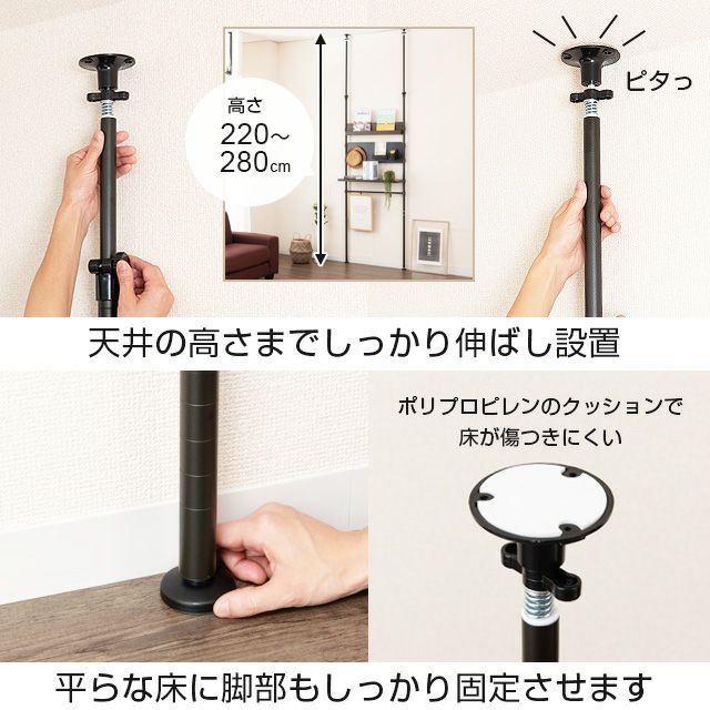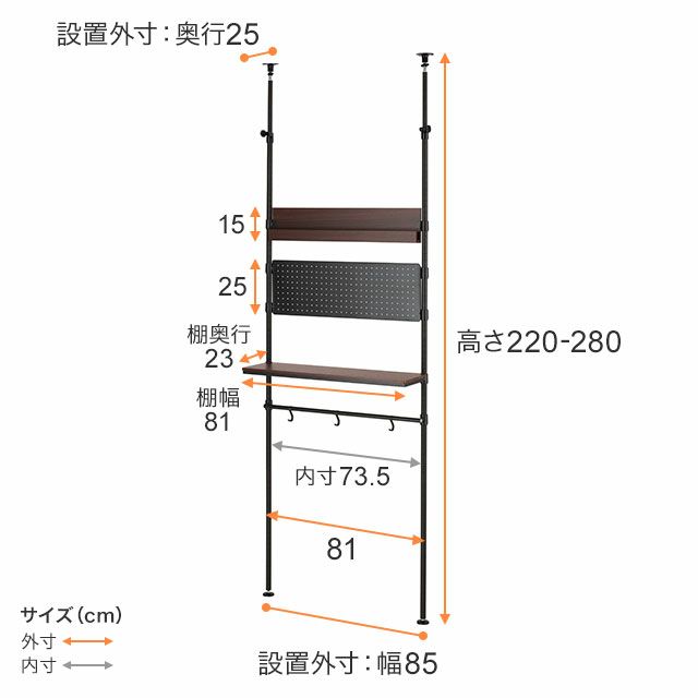 幅85×奥行25×高220~280cm(アジャスター装着時) ※中間ポールが約35cmですので、そちらを使用せずに上部+下部ポールのみで組み立てていただくことが可能です。 その場合、約185cm~ご使用いただけます。(最大高約245cm) |