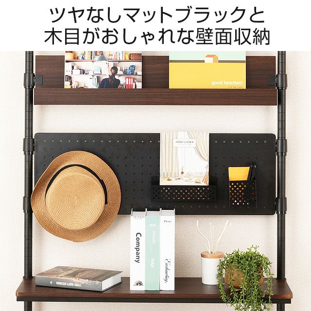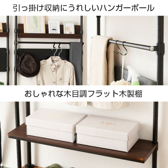 L字型木製棚×1 パンチングボード×1 ハーフウッドシェルフ×1 ハンガーポールセット×1(ネジ、ワッシャー、リング付属) ポール(3分割:テンションポール、中部ポール、下部ポール)×各2 テンションポール用ネジとワッシャー×6 S字フック×3 スリーブ×10(予備1組) 円形アジャスター×2 |