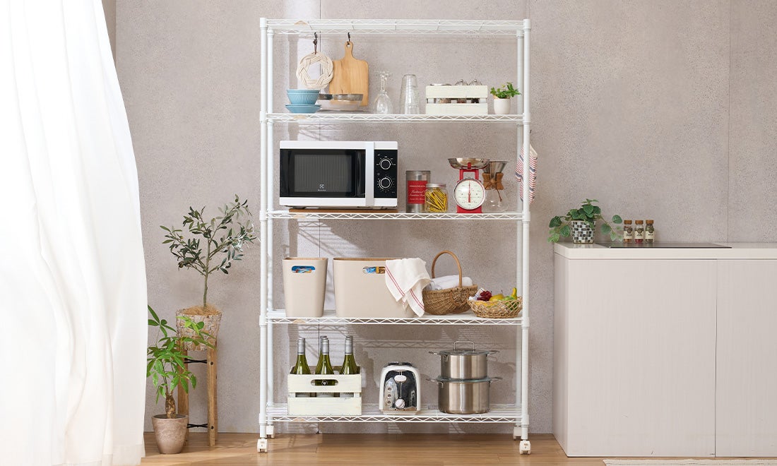 たっぷりの食器を収められ、電子レンジなど重量物も安心の高耐荷重。棚は高さ調節でき、空間にぴったりフィット。カラーはシルバーのほか、ホワイト・ブラックも用意。機能とデザインを両立する食器棚・レンジ台です。