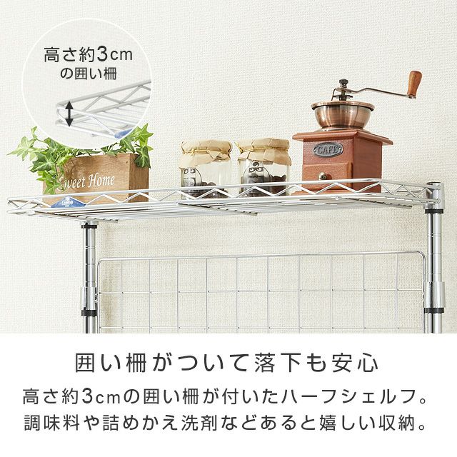 シェルフ、ハーフシェルフ、スライドシェルフ、背面ネット、ポール:スチール(クロームメッキ) 木製シェルフ:(天板)MDF、フレーム:スチール(クロームメッキ)スリーブ:ABS樹脂 キャスター:ナイロン樹脂 |