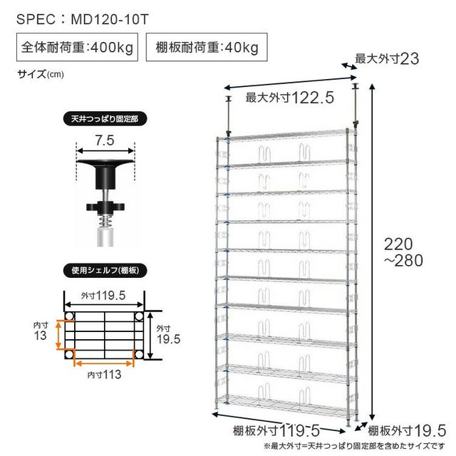 (約)幅122.5×奥行23×高220〜280cm ※天井固定パーツ、円形アジャスターを含めたサイズになります。 |