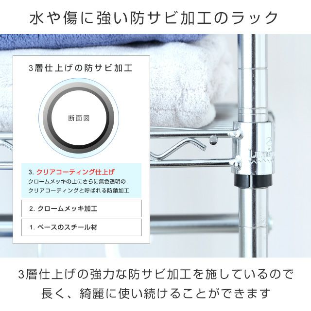 シェルフ(棚)・ポール:スチール(クロームメッキ)、スリーブ:ABS樹脂 |