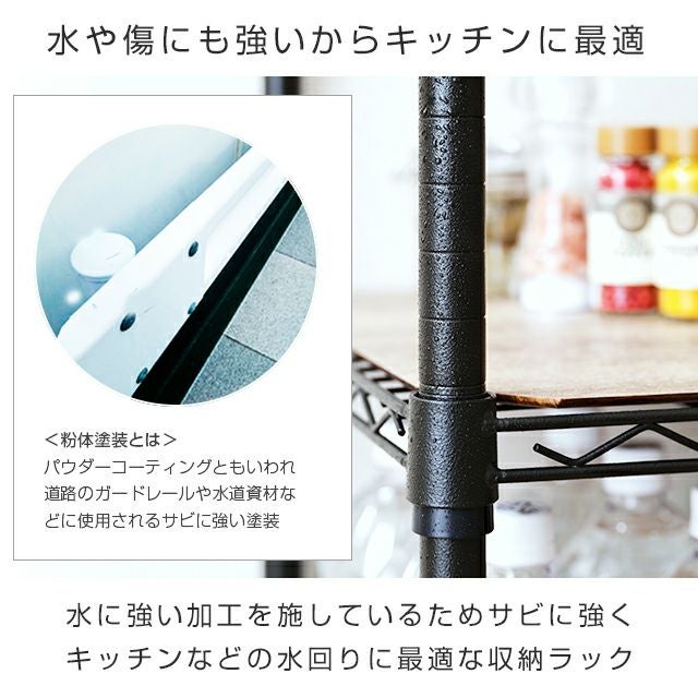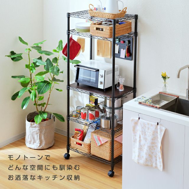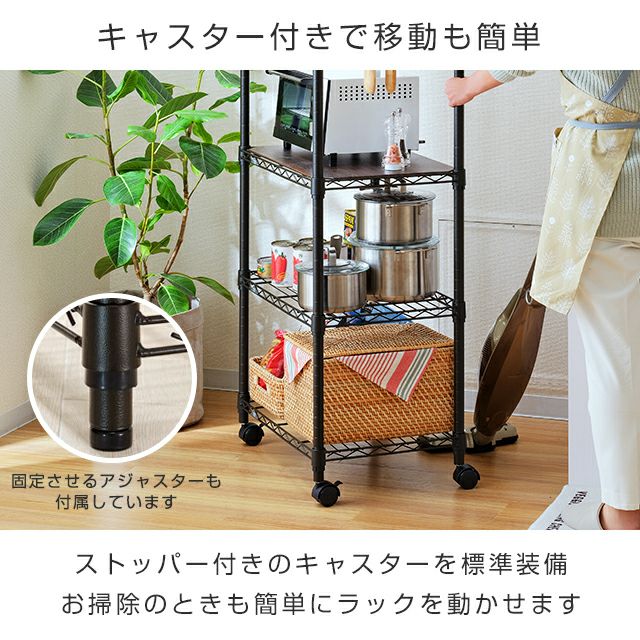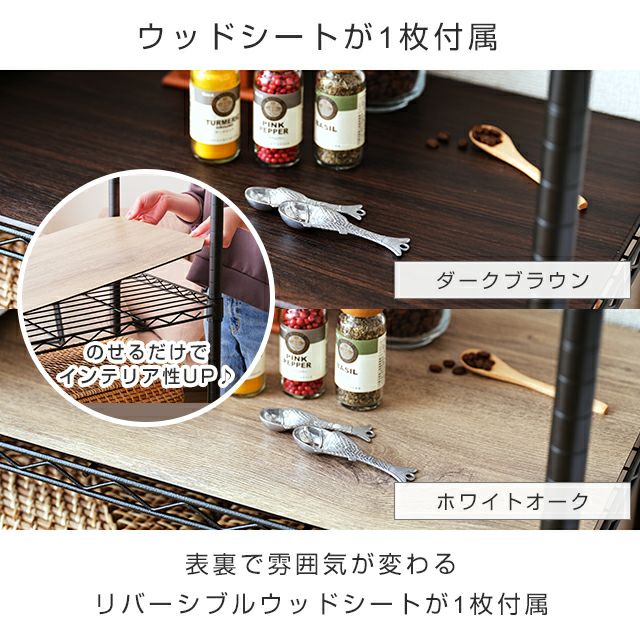 セット内容 ワイヤーシェルフ×5、ポール×4、スリーブ×20組(予備1組)、キャスター(ストッパー付き、ストッパー無し)各×2、アジャスター×4、ウッドシート×1、S字フック×2、有孔ボード×1、スパナ×1