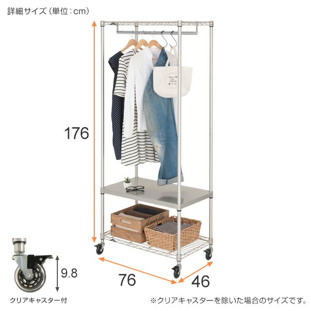 スチールシェルフ(棚板):スチール ポール:スチール ハンガーポール:スチール キャスター車輪部:ポリウレタン スリーブ:ABS樹脂 |