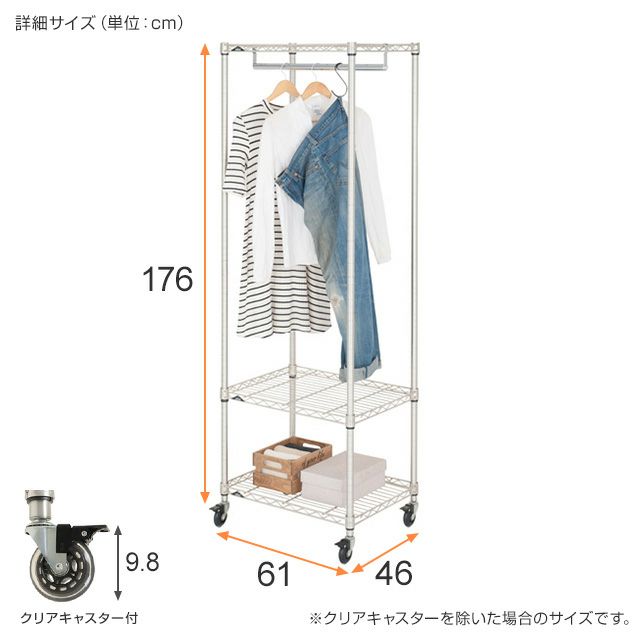スチールシェルフ(棚板):スチール ポール:スチール ハンガーポール:スチール キャスター車輪部:ポリウレタン スリーブ:ABS樹脂 |