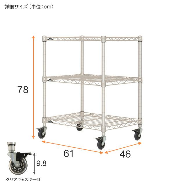 スズメッキ ワイヤーシェルフ(棚板)×3 スリーブ(棚板取付用部品)×12 スズメッキ ポール×4 クリアキャスター×4 |