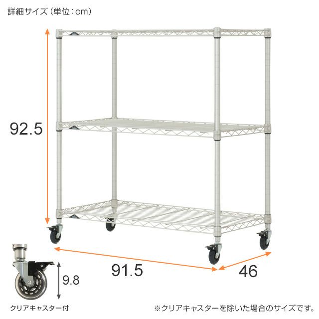セット内容 | スズメッキ ワイヤーシェルフ(棚板)×3 スリーブ(棚板取付用部品)×12 スズメッキ ポール×4 クリアキャスター×4 |