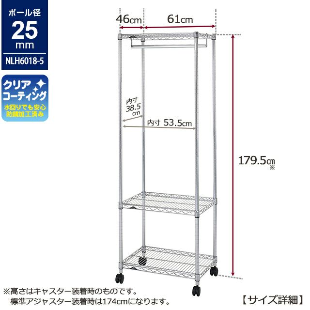 セット内容 | スチールシェルフ(棚板)×3枚 スリーブ(棚板取付用部品)×12組 ハンガーポール×1本 ポール×4本 ナイロンキャスター(ストッパー付)×2個 ナイロンキャスター(ストッパーなし)×2個 標準アジャスター×4個 スパナ×1個(キャスター取付用) |