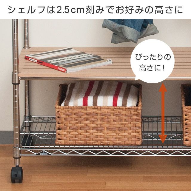 耐荷重(約) | 棚板1枚あたり | ワイヤーシェルフ:250kg ウッドシェルフ:80kg※値はシェルフ全面に均等に荷重をかけた場合の値になります。 |