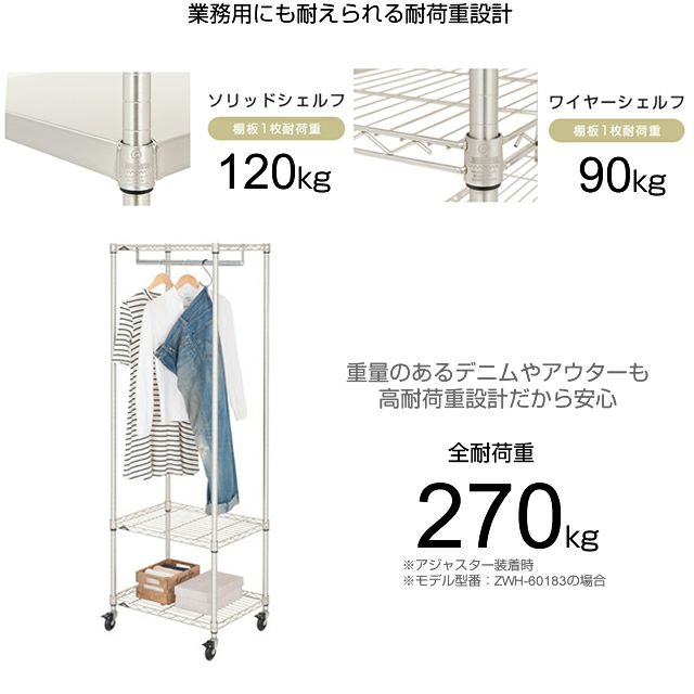 | 耐荷重(約) | 棚板1枚あたり | ワイヤーシェルフ:90kg ソリッドシェルフ:120kg※値はシェルフ全面に均等に荷重をかけた場合の値になります。 |