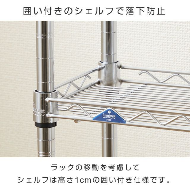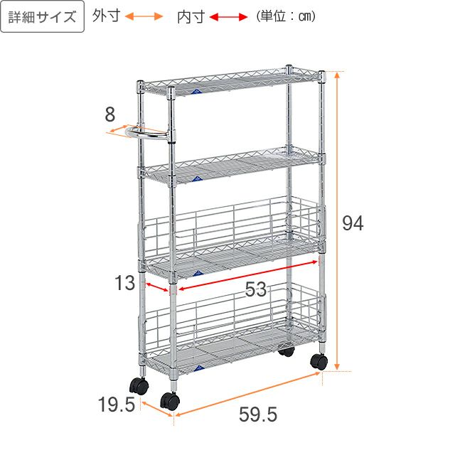 シェルフ、ポール、ハンドル、サポート柵(大、小):スチール(クロームメッキ) スリーブ:ABS樹脂 キャスター:ナイロン樹脂 |