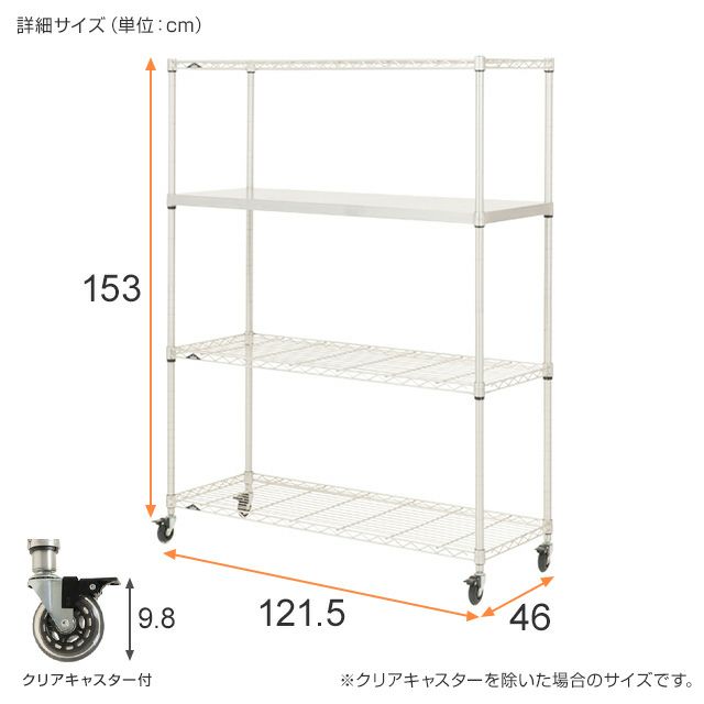 | セット内容 | スズメッキ ワイヤーシェルフ(棚板)×3 スズメッキ ソリッドシェルフ(棚板)×1 スリーブ(棚板取付用部品)×16 スズメッキ ポール×4 クリアキャスター×4 |