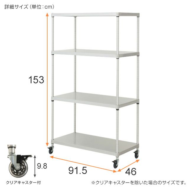 | セット内容 | スズメッキ ソリッドシェルフ(棚板)×4 スリーブ(棚板取付用部品)×16 スズメッキ ポール×4 クリアキャスター×4 |