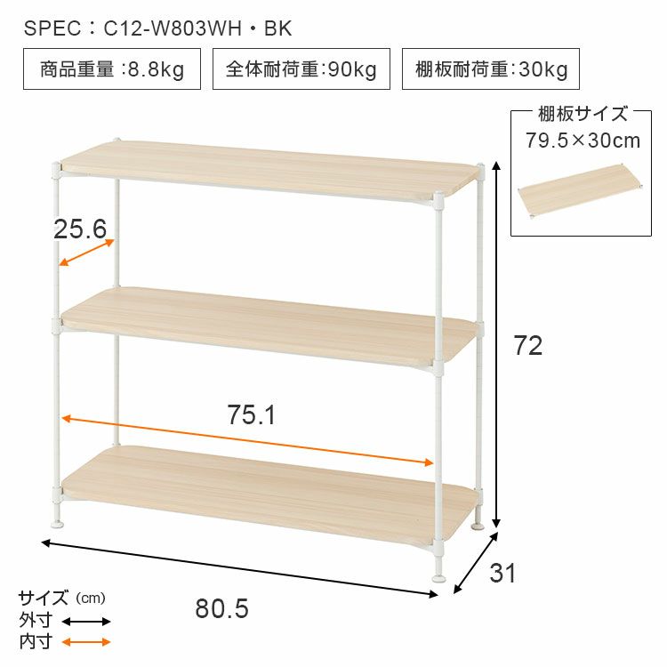 他の画像を見る NEW 交換保証対象品 SALE ウッドラック 幅80cm 3段 ルミナススマート スチールラック 幅80.5×奥行31×高さ72cm C12-W803 ¥ 10,800 のところ ¥ 7,980 税込 カートに入れる