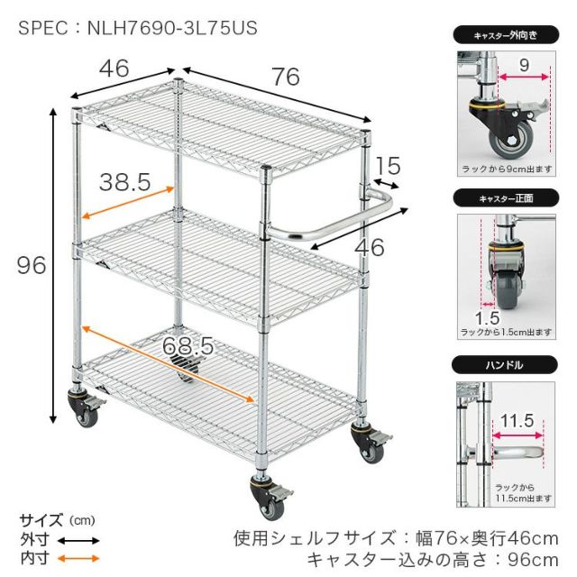 (棚板のみ)幅76×奥行46×高96cm (ハンドル含む)幅87.5×奥行46×高96cm |