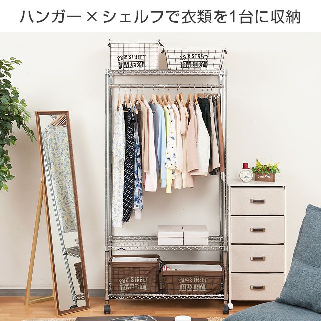 | セット内容 | スチールシェルフ(棚板)×3枚 スリーブ(棚板取付用部品)×14組 ポール×4本 ハンガーポール×1本 ナイロンキャスター(ストッパー付)×2個 ナイロンキャスター(ストッパーなし)×2個 標準アジャスター×4個 スパナ×1個(キャスター取付用) |