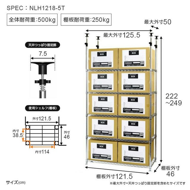 | 耐荷重(約) | 棚板1枚あたり | 250kg ※値はシェルフ全面に均等荷重をかけた場合 |