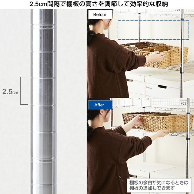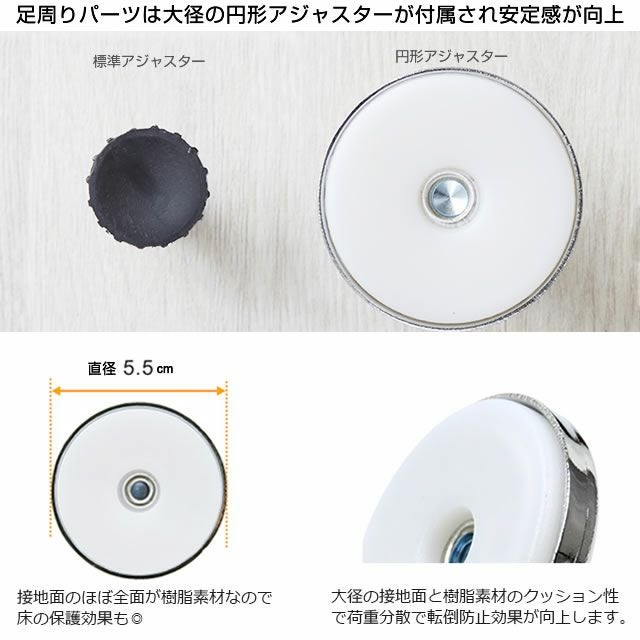 | 材質 | スチールシェルフ(棚板)・ポール:スチール(クロームメッキ) スリーブ:ABS樹脂 テンション部分:ポリプロピレン・ABS樹脂 |