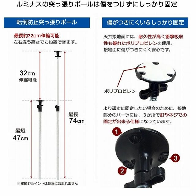 | 備考 | ・ルミナス 25mmポール専用パーツと完全互換 ・テンション使用時は天井に張りのある部分に設置してください。 ・テンション使用時は円形アジャスタのご使用をお薦め致します。 |
